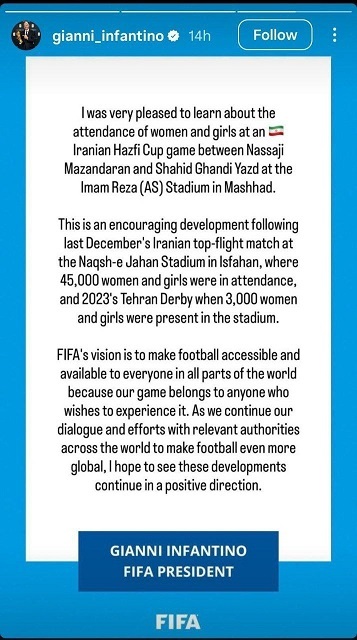 رئیس فدراسیون جهانی فوتبال با انتشار یک استوری، به حضور زنان در استادیوم امام رضا (ع) مشهد واکنش نشان داد.