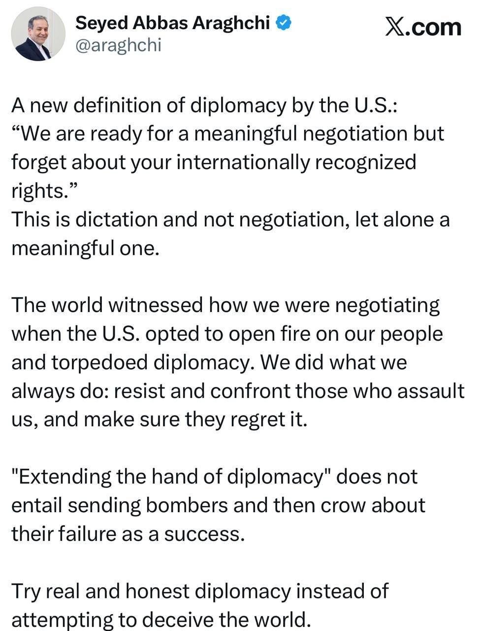 به گزارش نواندیش، او در توئیتی نوشت: تعریف جدید ایالات متحده از دیپلماسی: ما آمادهٔ مذاکرهای معنادار هستیم، اما حقوق به رسمیت شناختهشده بینالمللی خود را فراموش کنید!