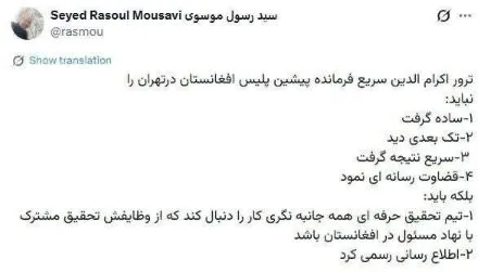 - تائید ترور اکرام الدین سریع فرمانده سابق پلیس افغانستان در تهران توسط مقام سابق وزارت خارجه