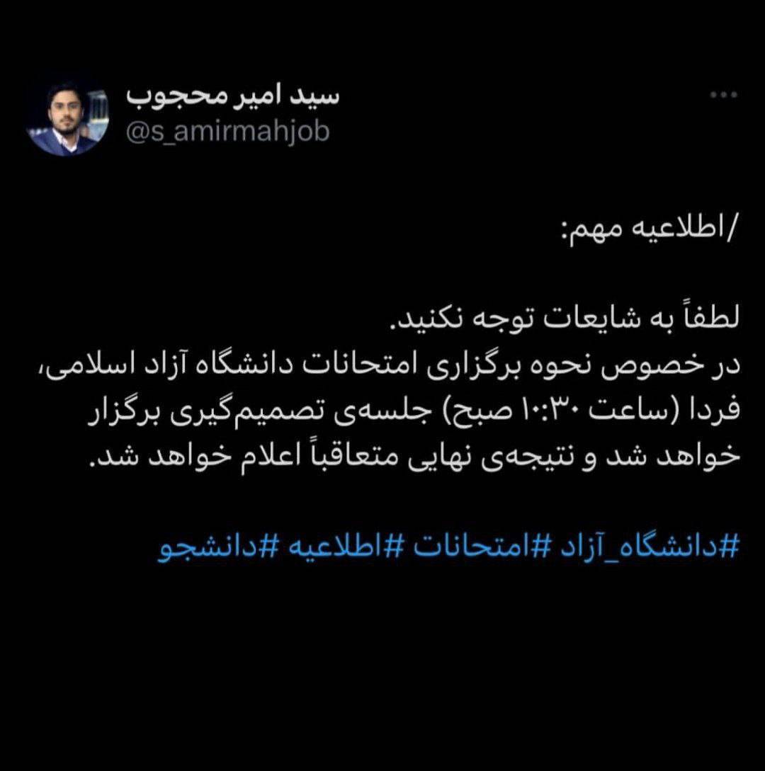 مدیر کل روابط عمومی دانشکاه آزاد در شبکه ایکس اعلام کرد به شایعات توجه نکنید. نحوه برگزاری امتحانات دانشگاه آزاد فردا اعلام میشود.