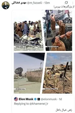 تسنیم: عضو دفتر حفظ و نشر آثار رهبر معظم انقلاب در واکنش به توئیت ایلان ماسک، با انتشار ۴ تصویر تاریخی (طوفان طبس ۱۹۸۰ - توقف و بازداشت قایق آمریکایی در خلیج فارس ۲۰۱۶ - حمله موشکی سپاه به پایگاه آمریکایی عین الاسد در عراق ۲۰۲۰ - پاسخ موشکی ایران و حمله به پایگاه آمریکایی العدید در قطر ۲۰۲۵)، نوشت: از بزرگترهات بپرس...!