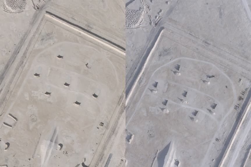 تصاویر ماهواره ای سامانه های دفاع هوایی پاتریوت آمریکا را در پایگاه هوایی العدید در 17 ژانویه (چپ) و 2 فوریه (سمت راست) نشان می دهند.