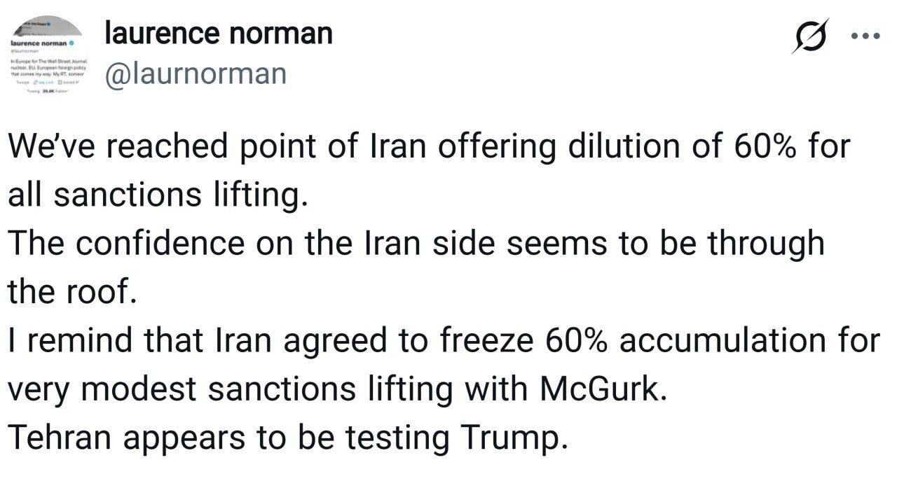 خبرنگار وال استریت ژورنال مدعی شد: ما به نقطهای رسیدهایم که ایران در ازای لغو همه تحریمها، رقیقسازی ۶۰ درصدی را پیشنهاد میدهد.