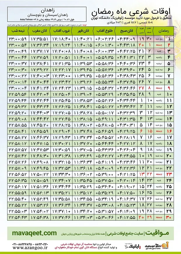 نواندیش: اوقات شرعی (اذان صبح، اذان ظهر و اذان مغرب) ماه رمضان ١٤٠٤ در زاهدان (از 30 بهمن 1404 تا 29 اسفند 1404): (ساعت اوقات شرعی در تمام شهرهای ایران را در این لینک ببینید)