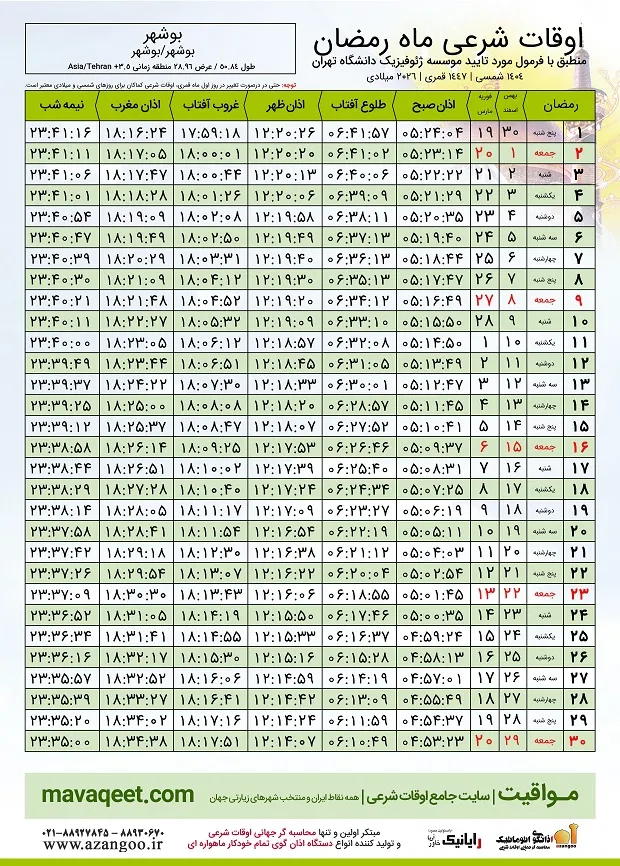 - اوقات شرعی ماه رمضان ۱۴۰۴ بوشهر + جدول ساعت اذان صبح، ظهر و مغرب