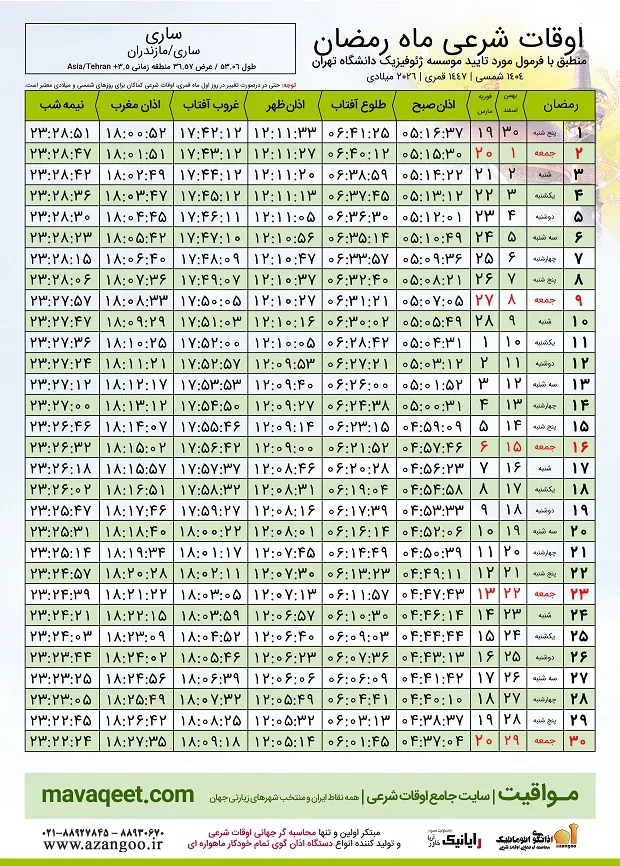 - اوقات شرعی ماه رمضان ۱۴۰۴ ساری + جدول ساعت اذان صبح، ظهر و مغرب