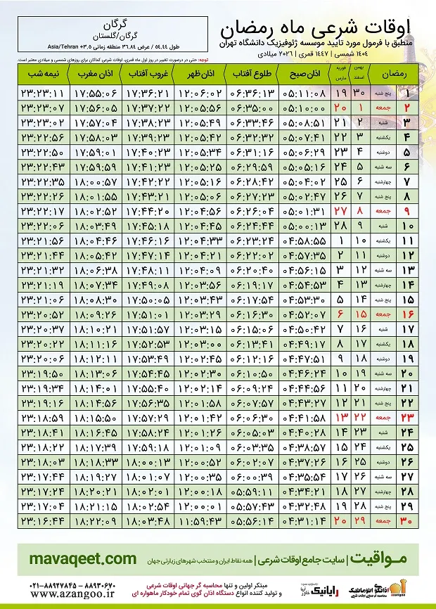 نواندیش: اوقات شرعی (اذان صبح، اذان ظهر و اذان مغرب) ماه رمضان ١٤٠٤ در گرگان (از 30 بهمن 1404 تا 29 اسفند 1404): (ساعت اوقات شرعی در تمام شهرهای ایران را در این لینک ببینید)