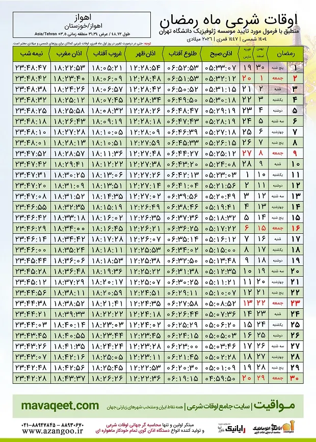 نواندیش: اوقات شرعی (اذان صبح، اذان ظهر و اذان مغرب)  ماه رمضان ١٤٠٤ در اهواز (از 30 بهمن 1404 تا 29 اسفند 1404): (ساعت اوقات شرعی در تمام شهرهای ایران را در این لینک ببینید)