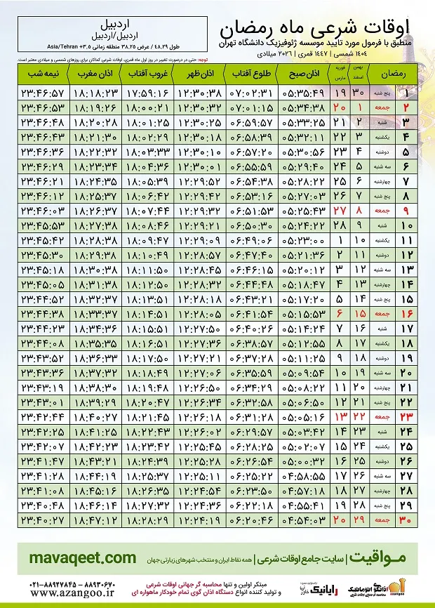 - اوقات شرعی ماه رمضان ۱۴۰۴ اردبیل + جدول ساعت اذان صبح، ظهر و مغرب