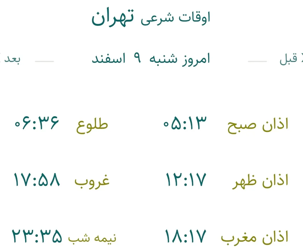 نواندیش: ساعت اوقات شرعی، اذان صبح، ظهر و مغرب (افطار) تهران امروز شنبه ۹ اسفند ماه ۱۴۰۴ - دهم ماه رمضان: