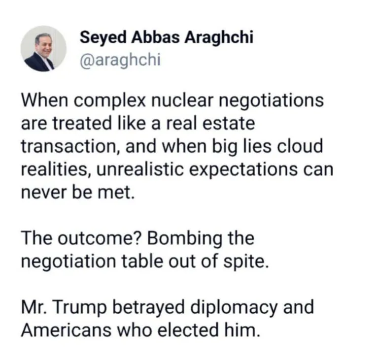 سید عباس عراقچی، وزیر امور خارجه، با انتشار پیامی در فضای مجازی به نقد سیاست‌های دونالد ترامپ در قبال پرونده هسته‌ای ایران پرداخت و رویکرد وی را عامل شکست دیپلماسی دانست.