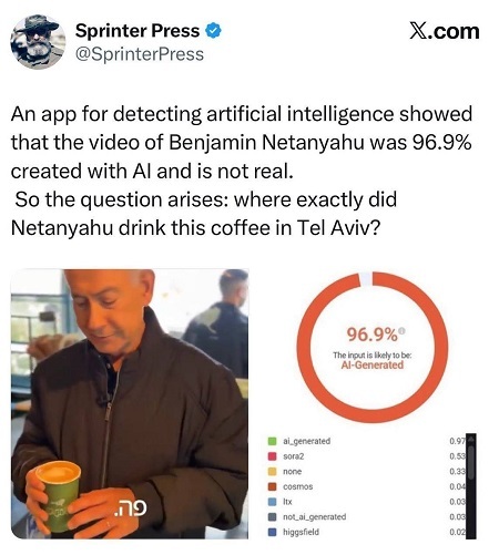 از نشانههای دیپفیک بودن فیلم اخیر، قهوهای است که تا لب لیوان پر است اما هرچه لیوان خم یا با سرعت جابجا میشود قطره ای از آن بیرون نمیریزد و یا اینکه هرچه نتانیاهو از آن میخورد کم نمیشود!