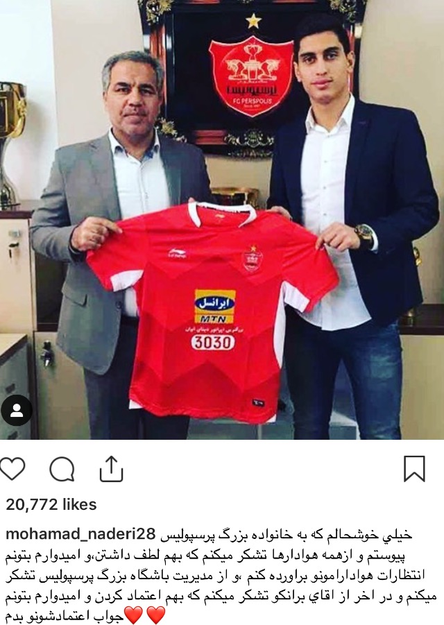 نوانديش: محمد نادرى پس از پيوستن به پرسپوليس پست زير را در صفحه شخصى اش منتشر كرد: