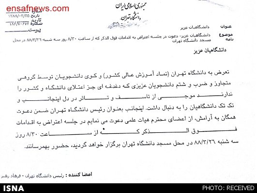 متن نامه به این شرح است: «تعرض به دانشگاه تهران (نماد آموزش عالی کشور) و کوی دانشجویان توسط گروهی متجاوز و ضرب و شتم دانشجویان عزیزی که دغدغه‌ای جز اعتلای دانشگاه و کشور ندارند موجی از تاسف و تاثر در دل اینجانب و تک تک دانشگاهیان را به دنبال داشت. اینجانب به عنوان رییس دانشگاه تهران ضمن دعوت همگان به آرامش، از اعضای محترم هیات علمی دعوت می‌نمایم در جلسه اعتراض به اقدامات فوق‌الذکر که از ساعت 8:30 روز سه شنبه 26/ 3/ 88 در محل مسجد دانشگاه تهران برگزار خواهد گردید، حضور بهم رسانند. رییس دانشگاه تهران - فرهاد رهبر».