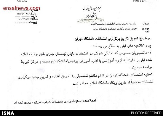 متن این نامه با عنوان درشت «تعویق تاریخ برگزاری امتحانات دانشگاه تهران» به این شرح است: «پیرو اطلاعیه‌های قبلی به اطلاع می‌رساند، یک: دانشجویان محترمی که آمادگی شرکت در امتحانات پایان نیمسال جاری طبق برنامه اعلام شده قبلی را دارند به گروه آموزشی یا اداره آموزش پردیس / دانشکده / موسسه و مرکز ذی‌ربط مراجعه فرمایند. دو: کلیه امتحانات دانشگاه تهران در تمام مقاطع تحصیلی به تعویق افتاده و تاریخ جدید برگزاری امتحانات متعاقبا از طریق وبگاه دانشگاه اعلام خواهد شد. معاونت آموزشی و تحصیلات تکمیلی دانشگاه - محمود کمره‌ای»